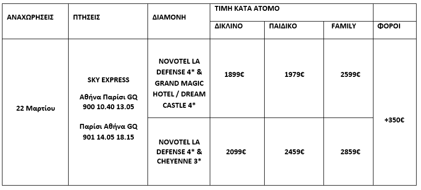 Νέος φόρος πόλης (city tax) υποχρεωτικός και πληρωτέος στα ξενοδοχεία του Παρισιού/ Grand Magic/Dream Castle : € 8,45 κατ’ άτομο  τη διανυκτέρευση για 4* ξενοδοχεία. Τα παιδιά κάτω των 12 ετών δεν πληρώνουν στην περίπτωση που μένουν με 2 ενήλικα άτομα στο ίδιο δωμάτιο. Στην περίπτωση που μία οικογένεια (2 ενηλ + 2 παιδιά) καταλαμβάνει 2 δίκλινα δωμάτια, θα πληρώσουν και τα 4 άτομα τα city taxes. Φιλοδωρήματα, αχθοφορικά  και ότι δε αναφέρεται στο πρόγραμμα.