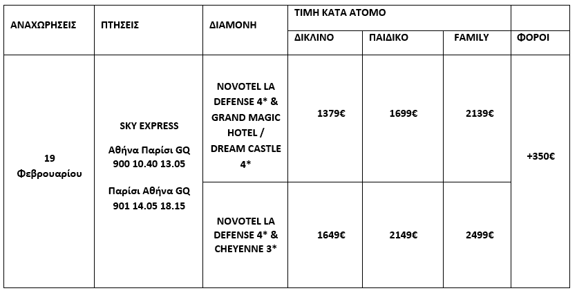 Νέος φόρος πόλης (city tax) υποχρεωτικός και πληρωτέος στα ξενοδοχεία του Παρισιού/ Grand Magic/Dream Castle : € 8,45 κατ’ άτομο  τη διανυκτέρευση για 4* ξενοδοχεία. Τα παιδιά κάτω των 12 ετών δεν πληρώνουν στην περίπτωση που μένουν με 2 ενήλικα άτομα στο ίδιο δωμάτιο. Στην περίπτωση που μία οικογένεια (2 ενηλ + 2 παιδιά) καταλαμβάνει 2 δίκλινα δωμάτια, θα πληρώσουν και τα 4 άτομα τα city taxes. Φιλοδωρήματα, αχθοφορικά  και ότι δε αναφέρεται στο πρόγραμμα.