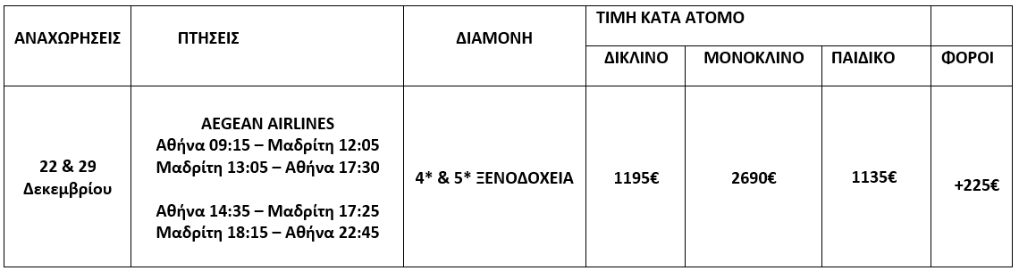 Αναχωρήσεις: 22 & 29 Δεκεμβρίου