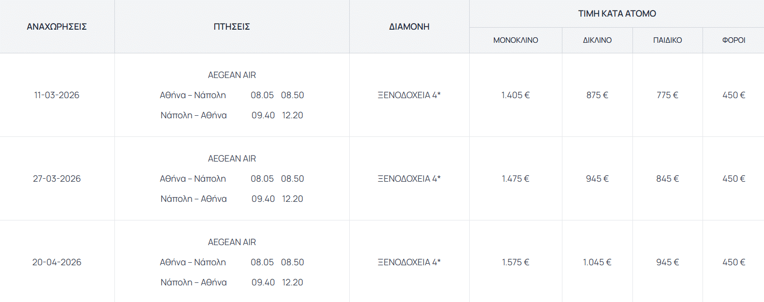 Μετά το πρωινό μεταφορά στο αεροδρόμιο της Νάπολης για την πτήση επιστροφής στην Αθήνα ή τη Θεσσαλονίκη.