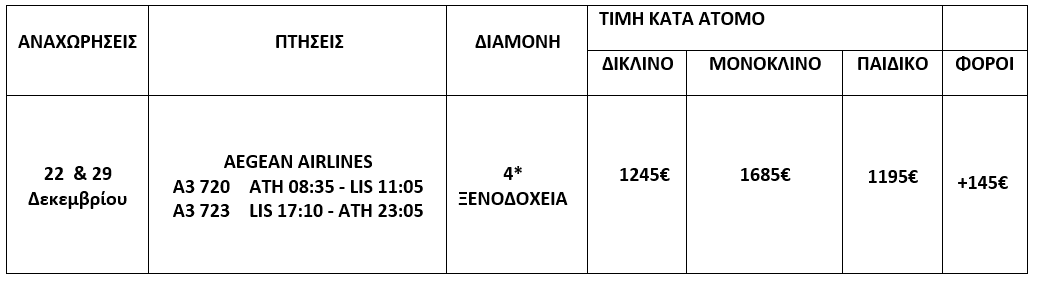 Μοναδική αναχώρηση: 22 & 29 Δεκεμβρίου
